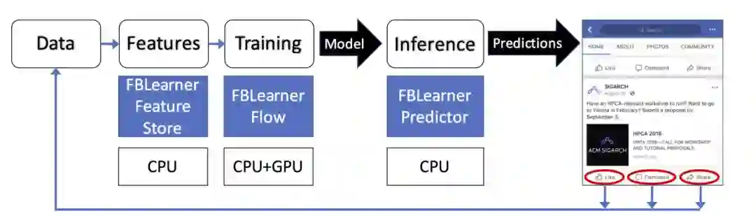 Facebook 有几个内部平台和工具包,目的是简化在 Facebook 产品中利用机器学习的任务。例如 FBLearner、Caffe2 和 PyTorch。FBLearner 包含三个工具,每一个都重点负责机器学习管道的不同部分。FBLearner 利用内部作业调度程序在 GPU 和 CPU 的共享池分配资源、安排工作。Facebook 大多数的机器学习训练通过 FBLearner 平台完成。这些工具和平台协同工作的目的是提高机器学习工程师的生产力,并帮助他们专注于算法的创新。