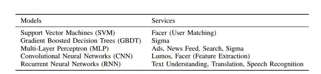 Facebook 使用的机器学习模型包括逻辑回归(Logistic Regression,LR)、支持向量机(Support Vector Machine,SVM)、梯度提升决策树(Gradient Boosted DecisionTree,GBDT),以及深度神经网络(Deep Neural Network,DNN)。LR 和 SVM 用于训练和预测的效率很高。GBDT 使用额外的计算资源可以提高准确性。DNN 是最具表现力的模型,有能力达到最高的准确性,但是它利用的资源最多(计算量至少超过像 LR 和 SVM 这样的线性模型一个数量级)。