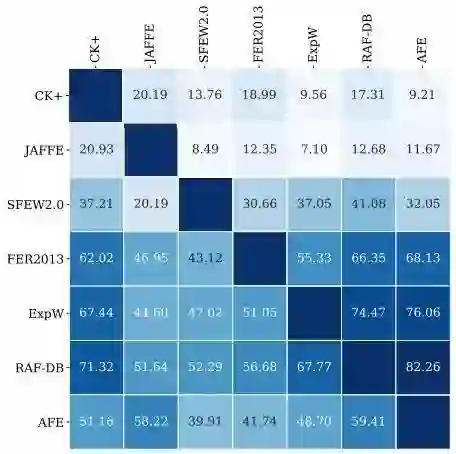 除了通过图像数据进行直观的感受外,我们还可以通过模型在各个数据集上的性能差异来衡量各个人脸表情数据集之间所存在的领域偏差。如图 3 所示,我们以 ResNet-50 作为骨干网络,分别在各个数据集上进行训练,再直接放该模型放在其他数据集上进行测试,由此得到全面且公平的基准结果。
