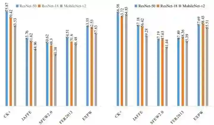 (2) 骨干网络选择不一致的影响: 当骨干选择不一致时,不同算法将无法公平的进行比较。为更好地理解这一点,我们在论文中分别以 ResNet-50,ResNet-18 和 MobileNet-v2 作为骨干网络进行实验分析。具体而言,我们分别统计了以 RAF 和 AFE 作为源域数据集时所有方法的平均测试结果:如图 5 所示,利用不同骨干网络进行特征提取会存在多达 12% 的性能差异,说明骨干网络选取不一致极大地阻碍了不同算法之间的公平对比。其中,图 5 所使用源域数据从左往右分别为 RAF 和 AFE。