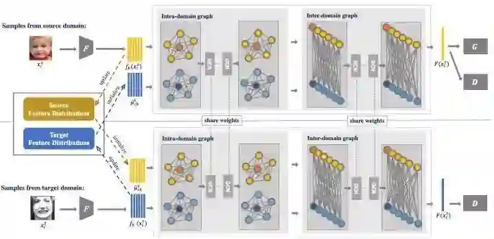 鉴于目前跨域人脸表情识别方法主要利用全局特征用于域迁移的情况,我们提出了一个新颖的对抗图表达学习框架,创造性地结合了图表达传播和对抗学习机制,以此实现跨域全局-局部特征的协同学习和迁移。具体而言,该框架首先构建两个图来分别关联每个域内和不同域之间的整体区域和局部区域。然后,该框架从所给定的输入图像中提取整体特征和局部特征,并使用可学习的各类统计分布来初始化相应的图节点。最后,该框架采用两个堆叠的图卷积网络在域内传播整体-局部特征以此探索整体区域与局部区域的相互关系,以及跨不同域传播整体-局部特征从而进行整体-局部特征的协同适应。通过这种方式,该框架可以自适应地学习细粒度的域不变特征,从而提高模型在跨域人脸表情识别设置下的性能。基于我们所提出的统一且公平的评测基准,该框架取得了优于所有现有方法的效果。