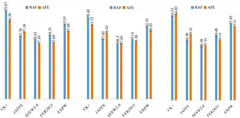 (1) 源/目标域数据集选择不一致的影响:当源/目标域数据集选择不一致时,不同算法将无法公平的进行比较。为更好地理解这一点,我们在论文中分别以 RAF 和 AFE 作为源域数据集进行实验分析,即我们统计了在使用不同骨干网络的情况下所有方法的评价测试结果:如图 4 所示,仅仅选取 RAF 和 AFE 进行源域对比实验就存在 9.29% 的性能差异,证明源/目标域数据选取不一致极大地阻碍了不同算法之间的公平对比。其中,图 4 中所使用骨干网络从左往右分别为 ResNet-50,ResNet-18 和 MobileNet-v2。