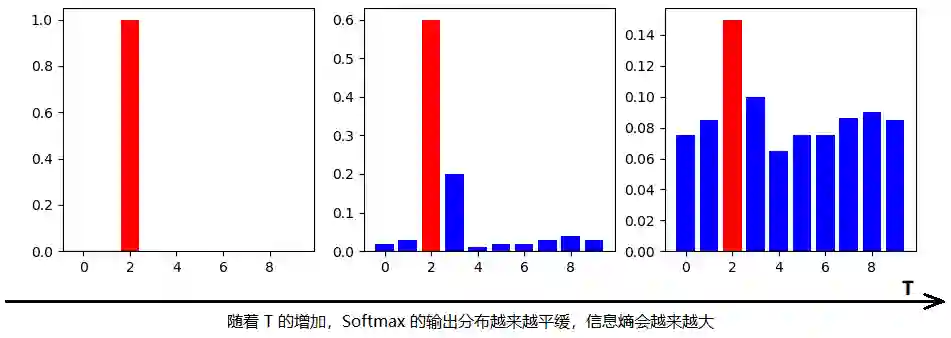 其中 是每个类别输出的概率, 是每个类别输出的 logits, 就是温度。当温度 时,这就是标准的 Softmax 公式。 越高,softmax的output probability distribution越趋于平滑,其分布的熵越大,负标签携带的信息会被相对地放大,模型训练将更加关注负标签。