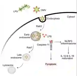 该研究发现革兰氏阴性细菌产生的细胞外膜泡(outer membrane vesicles, OMVs)可作为载体递送LPS进入宿主细胞质,在体外和体内实验中触发caspase-11依赖性免疫反应。OMVs通过内吞作用进入宿主细胞质,LPS从早期胞内体释放进入细胞质。使用OMVs生成能力被严重削弱的细菌突变体,揭示了OMVs在介导LPS到胞质的重要性。总的来说,该研究结果表明OMVs在革兰氏阴性细菌感染过程中传递LPS至宿主胞质然后活化caspase-11的关键作用。