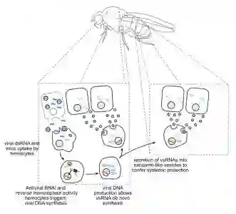 该研究显示果蝇具有由巨噬细胞样血细胞介导的复杂的基于全身RNAi的免疫。血细胞从感染的细胞中摄取dsRNA,通过内源转座子逆转录酶产生病毒衍生的互补DNA(vDNA)。这些vDNA模板从头合成二级病毒siRNA(vsRNA),分泌到外泌体样囊泡中。有趣的是,从感染果蝇的血淋巴中纯化的含有vsRNA的外泌体,在幼稚动物中赋予了针对病毒攻击的被动保护。因此,类似于脊椎动物,昆虫使用免疫细胞产生免疫记忆,其形式是稳定的vDNA,产生由含有vsRNA的外泌体介导的全身免疫。