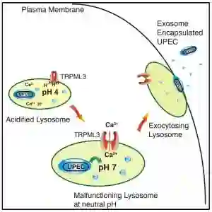 该研究表明,当尿路致病性大肠杆菌(UPEC)感染膀胱上皮细胞(BECs)时,它们被自噬靶向,但由于其中和溶酶体pH的能力而避免降解。粘蛋白TRP通道3(TRPML3)是一种定位于溶酶体的瞬时受体电位阳离子通道,可检测到这种变化。TRPML3激活自发启动溶酶体胞吐作用,导致外泌体包裹的细菌的排出。这些研究揭示了溶酶体稳态的细胞缺陷系统,这已被自主防御程序所采用以清除顽拗性病原体。