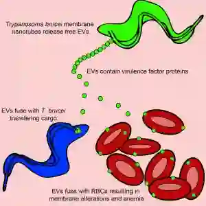该研究发现血流中的非洲锥虫由鞭毛膜产生膜纳米管并分解成游离的细胞外小泡(EVs)。锥虫细胞外囊泡包含几个有毒性的鞭毛蛋白,布氏锥虫罗德西亚亚种的细胞外囊泡包含血清耐药相关蛋白(SRA),此为人感染性所必需。布氏锥虫罗得西亚亚种的细胞外囊泡转移SRA到非人类传染性的锥虫,使其逃避人体先天免疫。锥虫细胞外囊泡还可以与哺乳动物的红细胞融合,造成红细胞被迅速清除,从而导致贫血。这些数据表明,锥虫细胞外囊泡是一种细胞器,可介导非遗传性毒力因子的转移,使宿主红细胞重构,从而导致贫血。