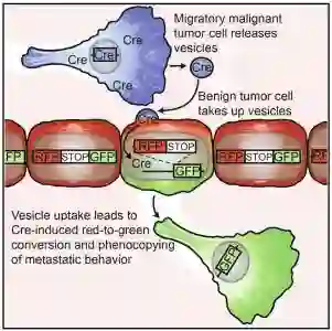 该研究使用Cre-LoxP系统直接鉴定体内接受EVs的肿瘤细胞。研究表明,由恶性肿瘤细胞释放的EVs被位于相同和远处肿瘤内较不恶性的肿瘤细胞摄取,并且这些EVs携带参与迁移和转移的mRNA。活体成像结果表明,摄取了EVs的较低恶性的肿瘤细胞显示增强的迁移行为和转移能力。肿瘤细胞局部和系统地分享EVs携带的分子,并且这会影响靶细胞行为。