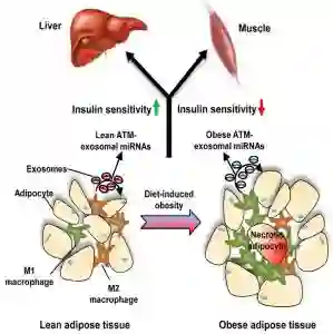该发现肥胖小鼠中的脂肪组织巨噬细胞(ATMs)分泌含有miRNAs的外泌体,当向瘦小鼠施用这些外泌体时,能够导致其葡萄糖不耐受和胰岛素抵抗。相反,从瘦小鼠获得的脂肪组织巨噬细胞外泌体在施用于肥胖个体时可以改善葡萄糖耐量和胰岛素敏感性。miR-155是肥胖个体脂肪组织巨噬细胞外泌体中过表达的miRNAs之一,早期研究表明PPARγ是miR-155靶标。该研究结果显示,与对照相比,miR-155敲除动物对胰岛素敏感并且耐受葡萄糖。此外,将野生型小鼠骨髓移植到miR-155敲除小鼠中能够减轻该表型。总而言之,这些研究表明,脂肪组织巨噬细胞分泌含有miRNAs成分的外泌体。这些外泌体中的miRNAs可通过旁分泌或内分泌调节的机制转移到胰岛素靶细胞,对胰岛素敏感性和总体葡萄糖平衡具有调节作用。