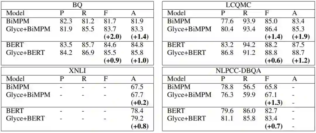 此外,在句对分类、单句分类任务的各个数据集上 Glyce-Bert 都能取得较 Bert 更好的结果,下表是实验结果。