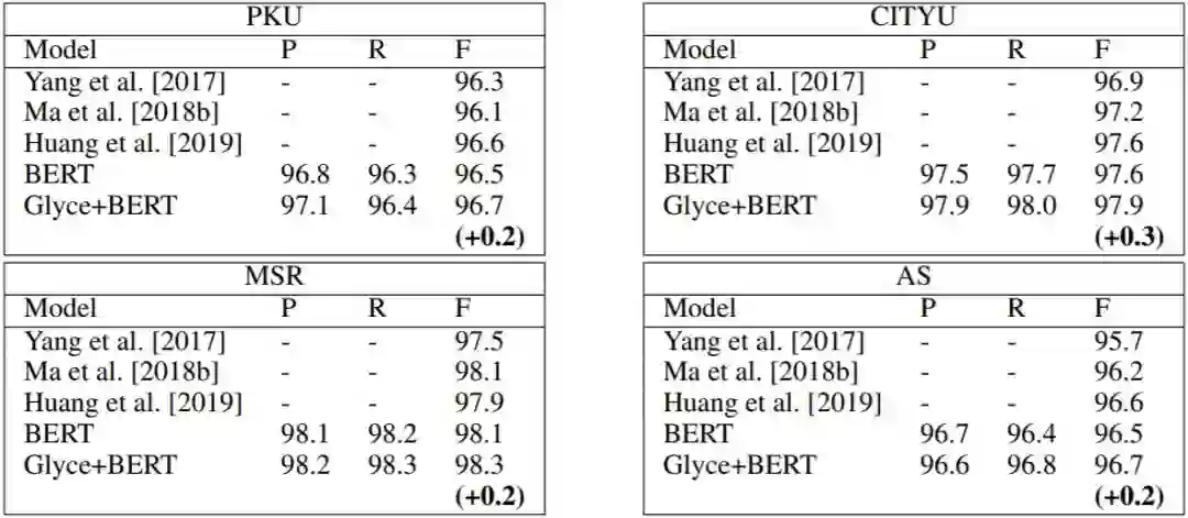 下表是 POS 实验结果,加入 Glyce 后,对 Lattice-LSTM 和 Bert 都有相应的提升。