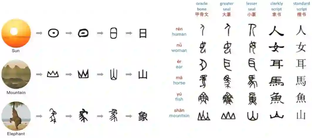 中文作为世界上最典型的意音文字(Logogram),其每个字既表示语素,又表示音节,其中,最为特殊的是汉字的表意功能,即象形表意能力。尽管当今的简体字在很大程度上已经无法推知其最初的象形意义,但是汉字的发展过程依然可以给我们很多的字义信息,如下图所示: