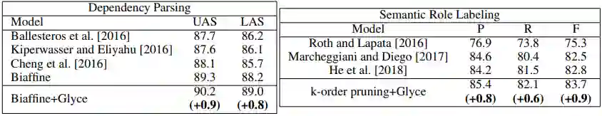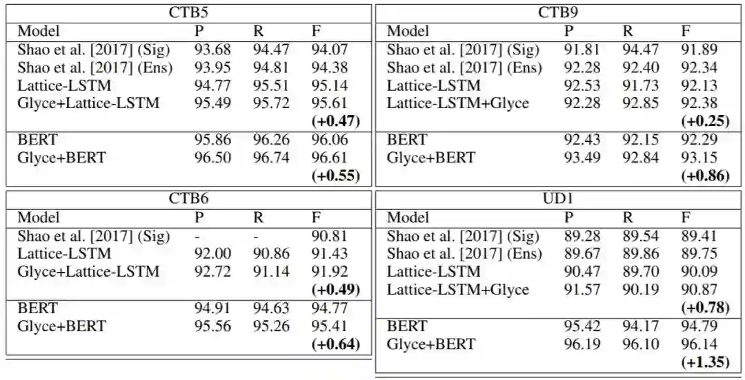 在中文 SRL 和中文依存句法分析上,相比之前的最优结果(未使用 Bert),使用 Glyce 之后能取得接近 1 个点的提升。
