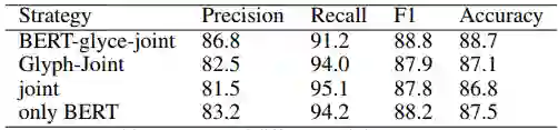Glyph-Joint:首先固定 Bert 去微调 Glyce,然后再结合微调 Bert 和 Glyce。