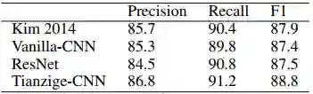 最后,来分析 CNN 结构的影响。在对比了 [Kim, 2014]、[He, 2016] 和 Vanilla-CNN 后,结果如下。可以看到,使用 Tianzige-CNN 能显著提高 F1 值。
