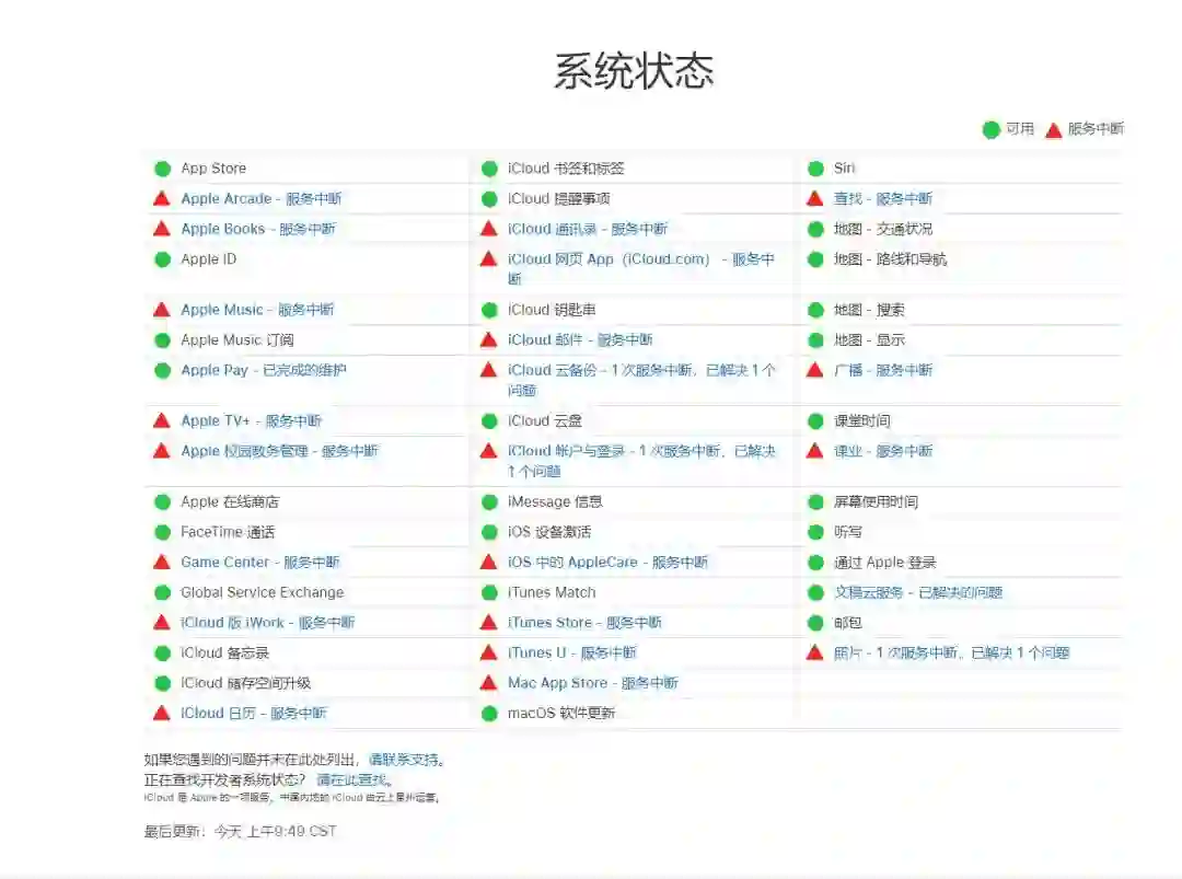 今晨,Apple 服务器出现大范围故障,涉及范围不局限于中国大陆,美国、英国等地区的服务器均出现了服务不可用的状况。涉及 App 包括 iCloud 服务、App Store 连接以及 Apple Music、Apple TV+、Apple Arcade 等订阅制服务。