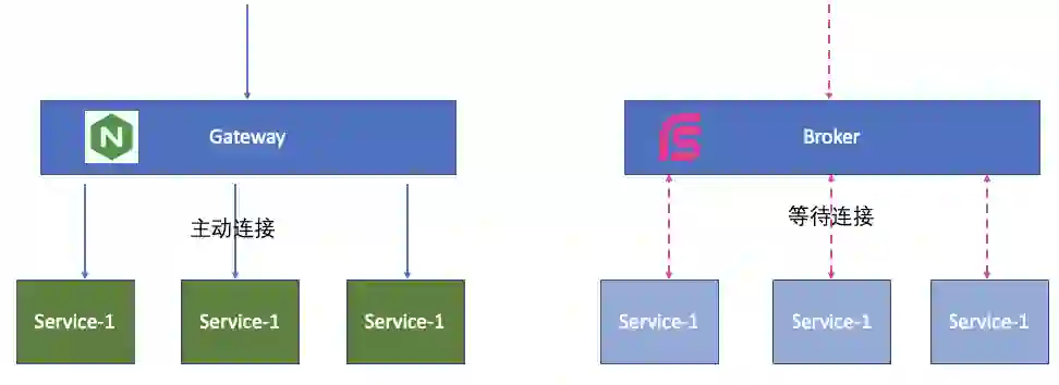 大多数的Gateway设计都采用主动连接的方式,也就是Gateway主动去连接上游服务的Proxy模式,当然要连接到上游服务还需要借助服务注册发现,智能DNS等,其中的原理就不赘述啦。而Broker架构则采用被动模式,也就是等待服务连接到Broker上,也就是当服务Ready后,主动连接到Broker就可以,然后基于应用和Broker之间建立的长连接,进行请求转发即可。对比Gateway架构,Broker模式简单很多,内部不用管理上游服务的连接池,不需要服务注册发现,当然对网络也没有特殊的打通要求,混合云的场景也适用等。
