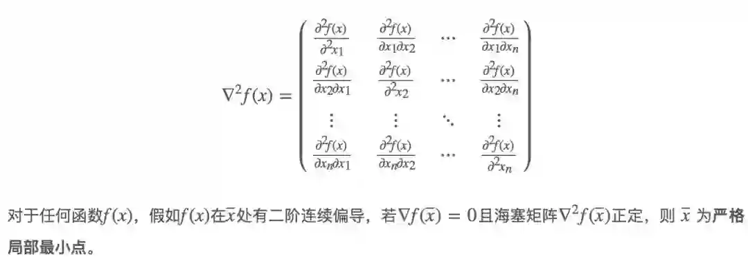 海塞矩阵的定义与梯度类似,但是求的是二阶偏导,并且结果是一个矩阵,如下所示