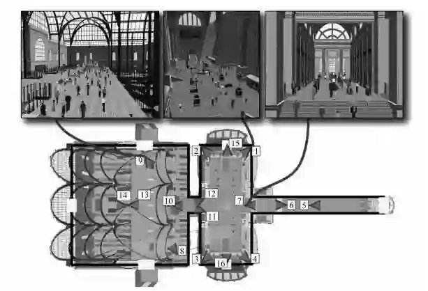 虚拟火车站的平面图(包括站台和火车轨道(左)、主候车室(中)和购物商场(右).该摄像机网络包括16台虚拟摄像机)