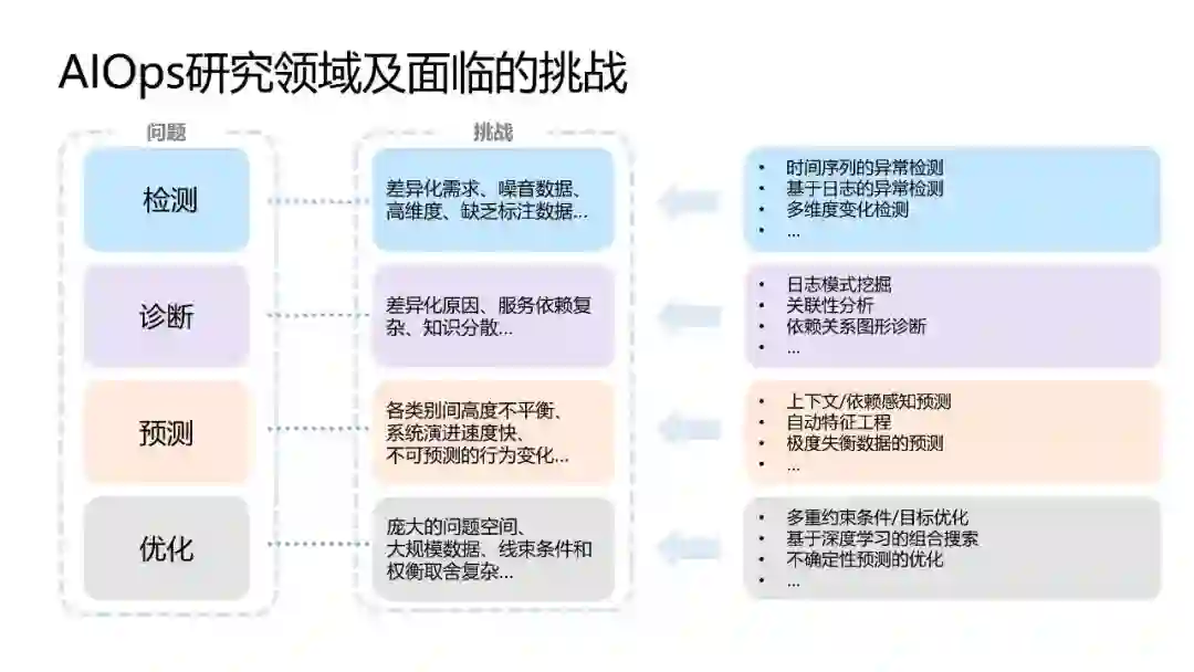 AIOps 的研究主要聚焦于检测、诊断、预测和优化四个领域,每个领域涵盖的运维任务不同,又各自面临不同的挑战