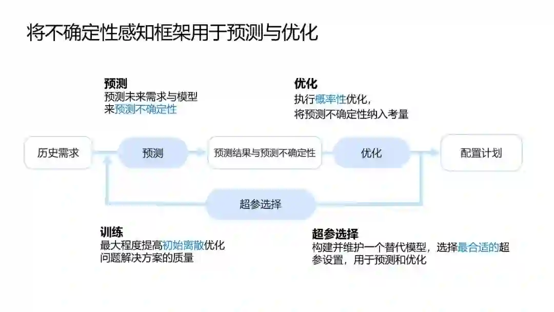 不过,依然面临一些挑战,比如可预测的 VM 需求量少,存在大量的 VM 类型和差异化 VM 需求模式。此外,预测不确定不可避免,难以纳入优化体系中。决策变量和约束条件是离散,且离散域的优化是 NP - 难问题。对此,微软亚研提出了全新的方法框架,将不确定性感知框架用于预测与优化。结果表明,微软亚研提出的方法实现了相较于其他竞品更优的表现。