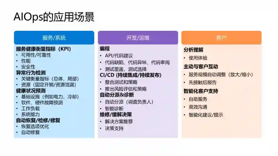 下图为 AIOps 分别针对服务 / 系统、开发 / 运维和客户的应用场景: