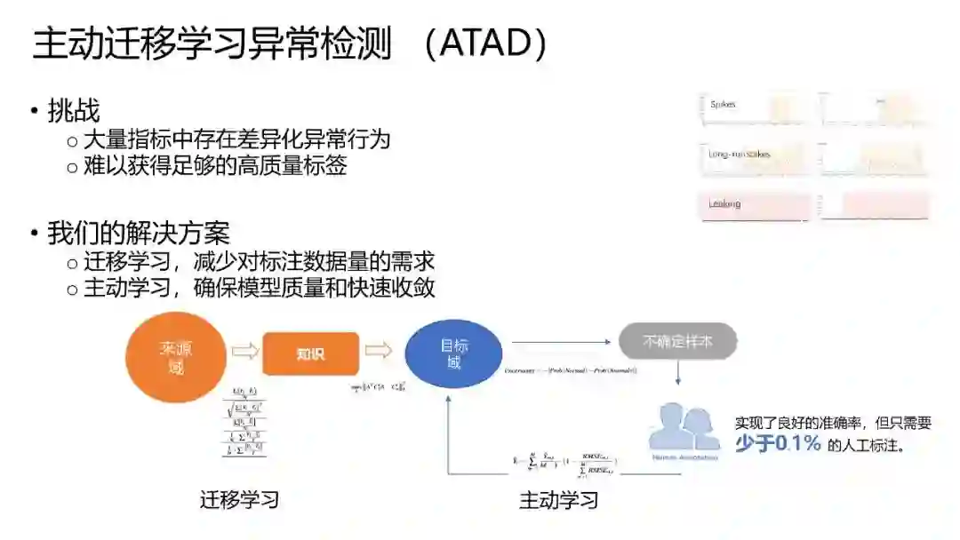 其中,在检测异常过程中,微软亚研在论文《Cross-dataset Time Series Anomaly Detection for Cloud Systems》中提出了主动迁移学习异常检测(Active Transfer Anomaly Detection, ATAD),它集成了迁移学习和主动学习技术。迁移学习用于将知识从源数据集迁移至目标数据集,主动学习用于确定未标注数据集中一小部分样本的信息标签。