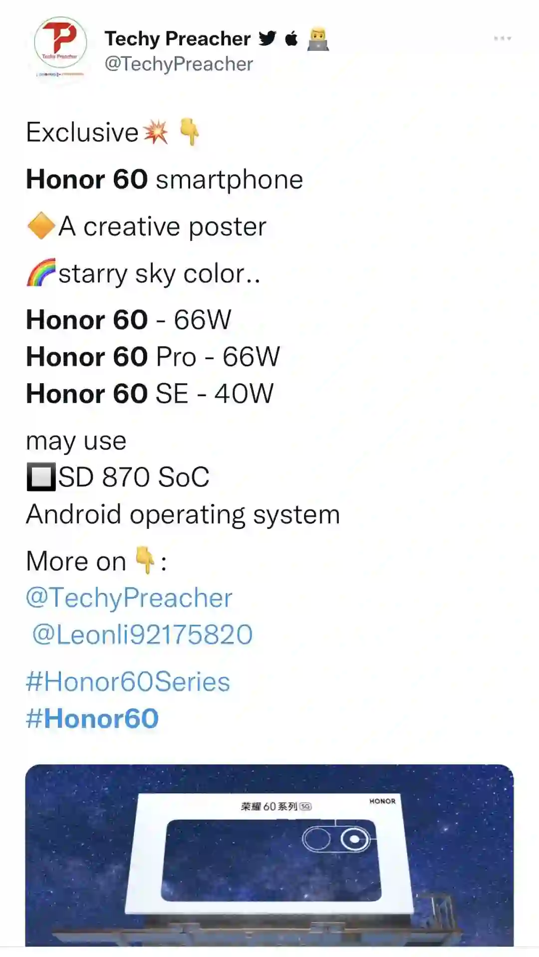 荣耀终端有限公司中国区 CMO 姜海荣今日微博宣布,将于 11 月 22 日宣布新品,号称“2021 手机颜值天花板”。有网友根据姜海荣发布的星空图猜测就是此前爆料的荣耀 60 系列,荣耀 60 系列的创意海报与今日发布的星空图概念一致,摄影头模组造型神似华为 P50 系列。最近也有海外博主爆料,60 系列可能采用全新的配色,类似于星空秘境的颜色设计,在主打潮流和时尚方面赋予更多新的内容。