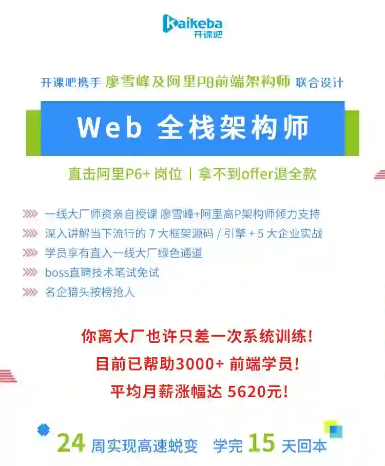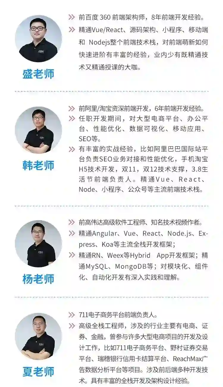 教研组充分调研了阿里、百度、滴滴、腾讯、头条、美团、蚂蚁金服这些头部互联网公司中 Web 高级工程师的开发能力模型,课程内容输出更契合当前市场主流技术和一线大厂用人标准。