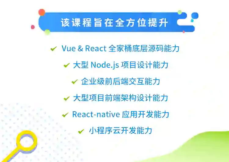 为了同步前端行业最新的技术趋势,本期课程较前一期更新了 15%,重磅更新的内容如下: