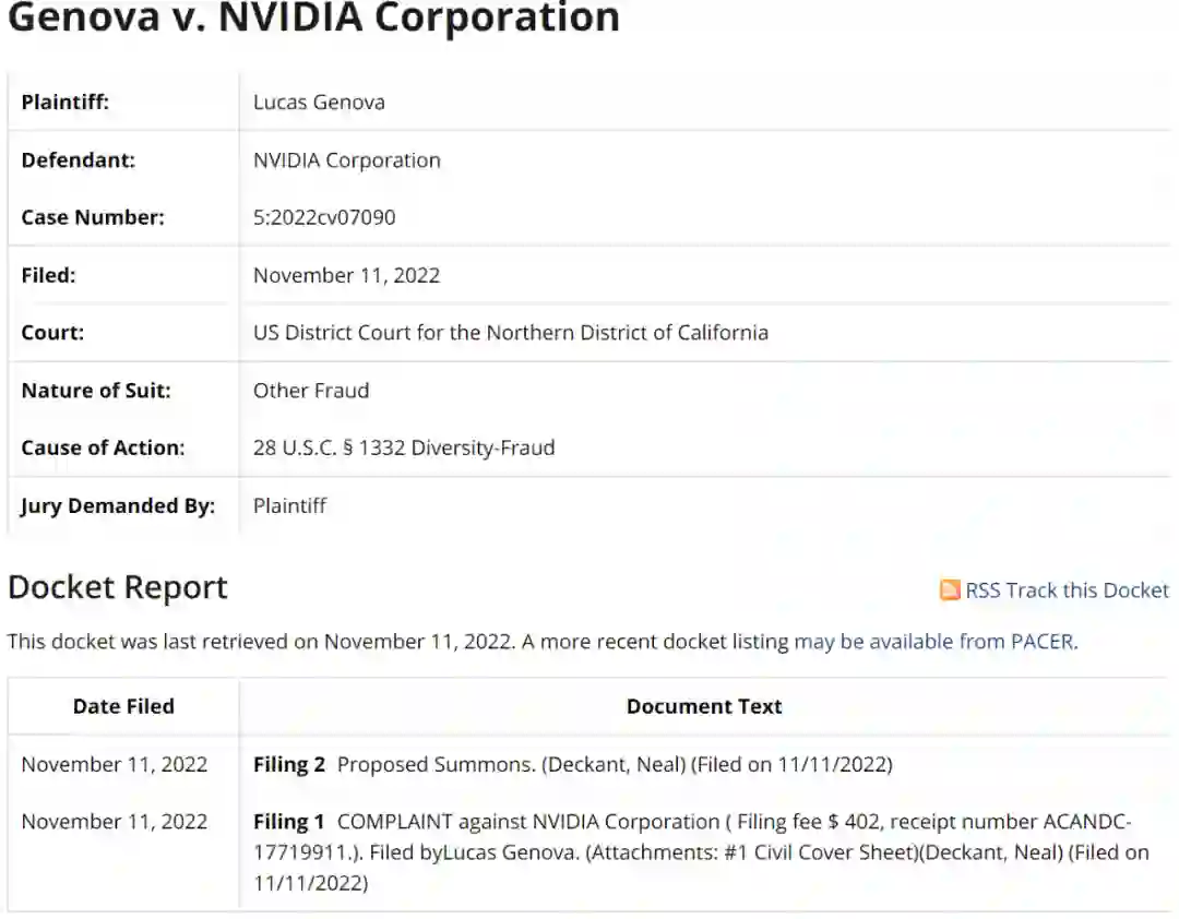 近日,根据公正网 Justia 消息,一位用户(Lucas Genova)将英伟达告上了法庭, Genova 就最近 16-pin 电源适配器烧毁事故对英伟达提起集体诉讼。诉讼文件显示,Genova 以不当得利、违反保证、欺诈和违反纽约《一般商业法》为由将英伟达起诉。