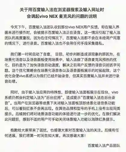 “这个优化策略会在场景化语音条以及语音面板展示的时候起效,这个优化会使vivo系统认为我们已经开始录音,但其实百度输入法并未进行录”。