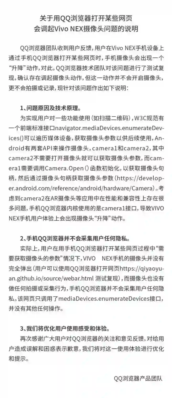 声明表示,在使用 QQ 浏览器的时候会引起 vivo NEX 摄像头被调用弹出是因为调用了相关的硬件接口,这一动作虽然会引起摄像头升降,但是 QQ 浏览器并没有拍摄用户的行为,换句话说就是“我就看看,并不拍摄”。