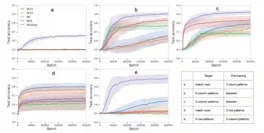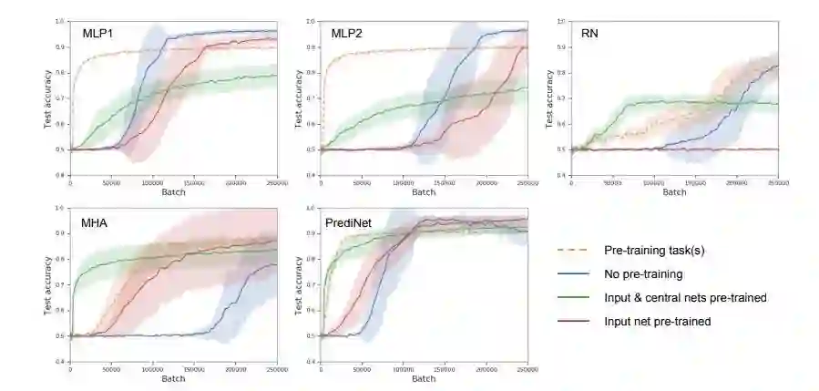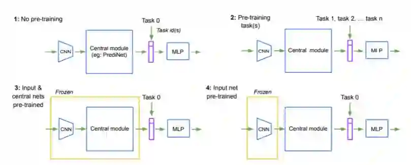 为了评估 PrediNet 生成表征的通用性和可重用性,研究者将实验分为四个阶段,其中,1)该网络在一个或多个任务的课程上进行预训练;2)输入 CNN 和 PrediNet 中的权重都是固定的,但输出 MLP 中的权重根据随机值进行重新初始化;3)该网络在一个新的目标任务或一组任务中进行重新训练(如图 3 所示)。