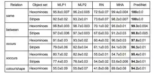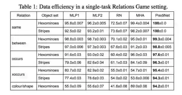 在研究通用性和可重用性之前,研究者先探索了 PrediNet 架构在单任务 Relation Game 设置中的数据有效性。结果取自 5 项任务:「same」、「between」、「occurs」、「xoccurs」和「colour / shape」,如表 1 所示。