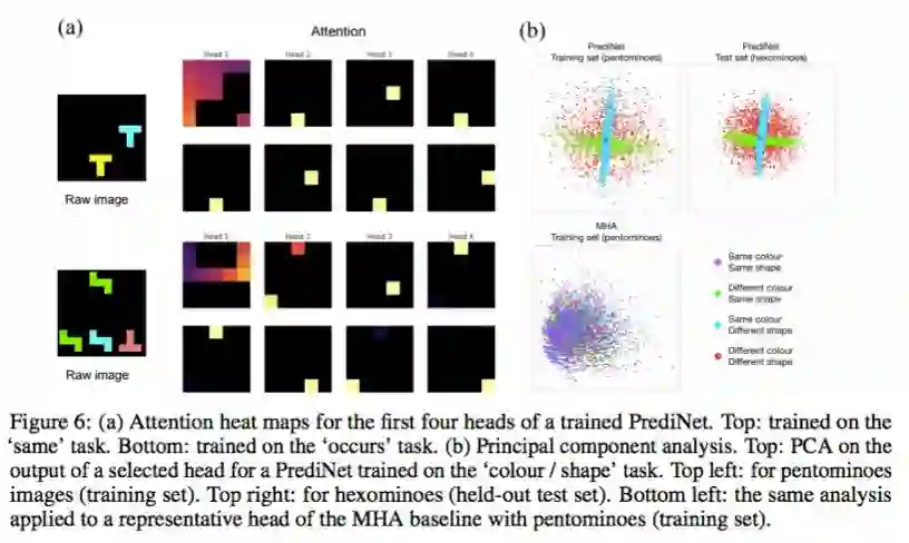 图 6:(a)PrediNet 前四个头的注意力热图。(b)主成分分析(PCA)。