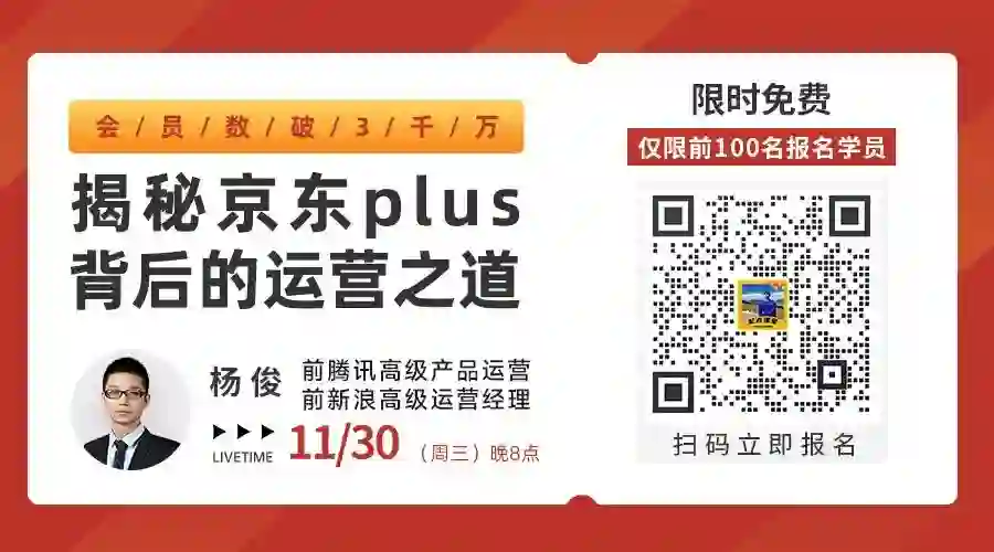 为此,我们特邀了前腾讯高级产品运营,在互联网运营领域深耕16年之久@杨俊老师,在11月30日(周三)晚上20点,展开一期《会员数破3千万,揭秘京东plus背后的运营之道!》的直播!
