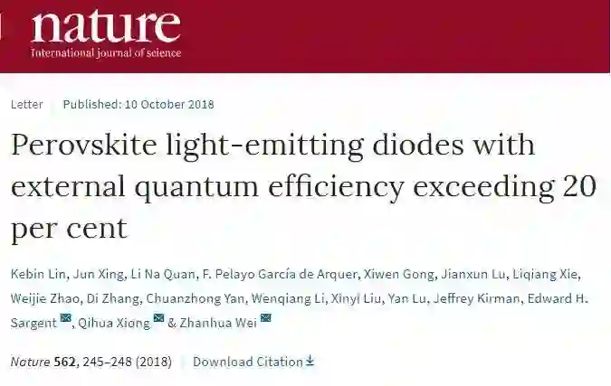 2018年10月11日,Nature在线发表了华侨大学为第一完成单位的研究论文《Perovskite Light-Emitting Diodes with External Quantum Efficiency Exceeding 20 percent 》,报道了钙钛矿电致发光领域的重大研究进展。华侨大学魏展画教授等提出了一种全新的薄膜制备策略并优化了LED器件结构,制备出了高亮度、高量子转换效率和较好稳定性的钙钛矿LED器件。其中,该钙钛矿LED器件的外量子效率高达20.3%,刷新了世界纪录。