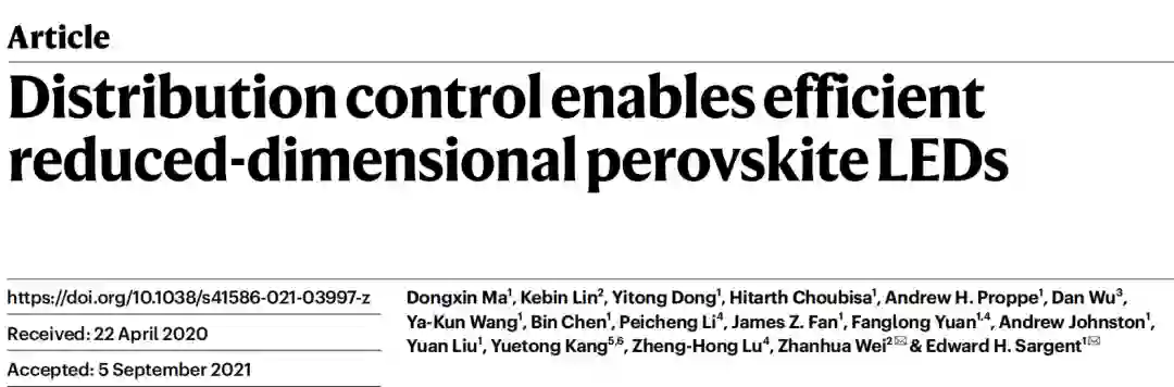 3年后,2021年11月25日,国际顶刊Nature在线发表了加拿大多伦多大学电子与计算机工程系Edward H. Sargent团队和华侨大学发光材料与信息显示研究院、材料科学与工程学院魏展画团队合作完成的研究论文,题为《Distribution control enables efficient reduced-dimensional perovskite LEDs》。