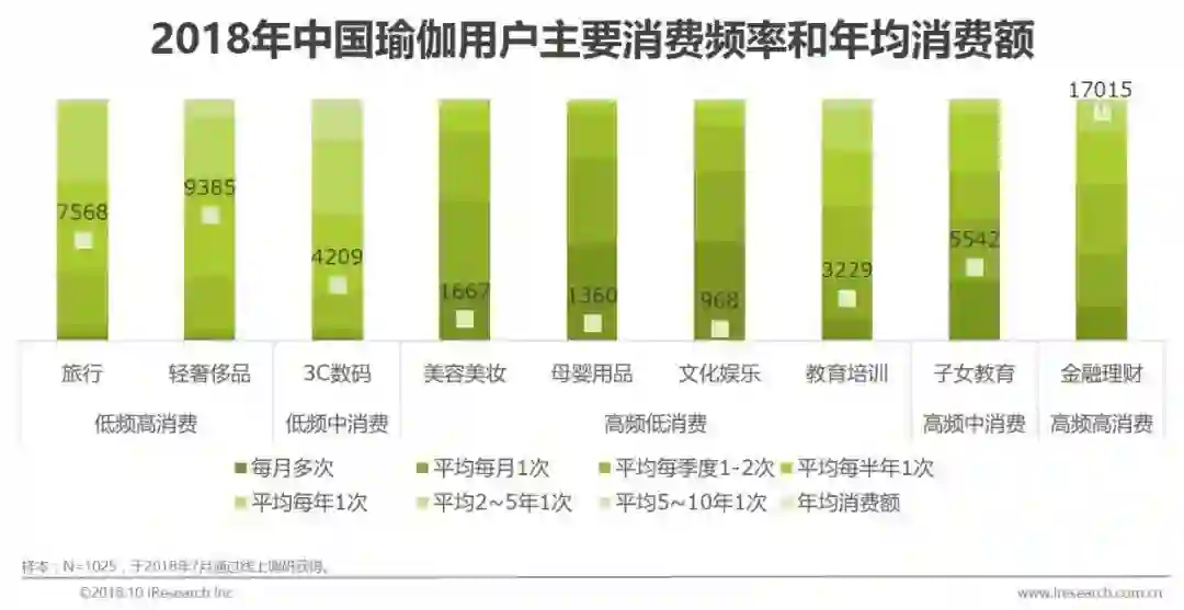 用户调研结果显示,经常练习瑜伽的用户大部分处于中等收入及以上人群,年结余用于理财的金额17000元左右;年消费支出较高的领域为旅行和轻奢侈品,拥有低频高消费的特点;年消费支出中等的领域为3C数码和子女教育;年消费支出较低,消费频次较高的领域有美容美妆、母婴用品、文化娱乐和教育培训。