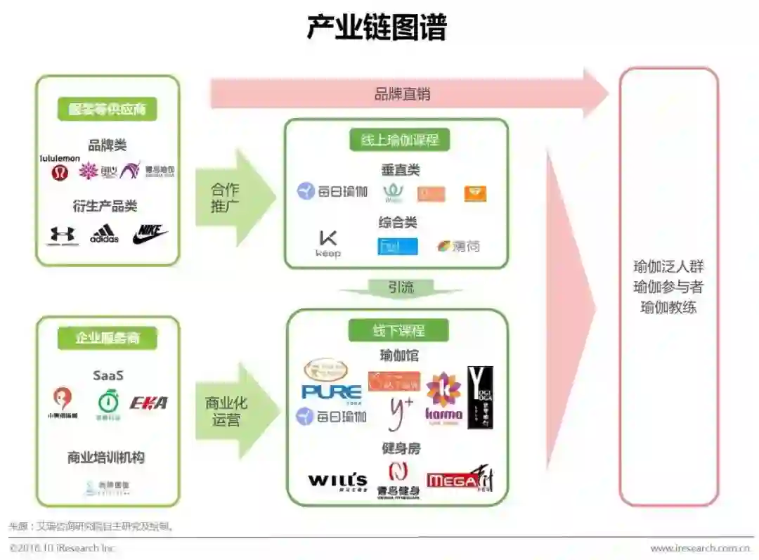 瑜伽以课程服务(主要来自线下瑜伽馆)为中心,衍生出一条包括教练培训、瑜伽普及、服装辅具以及商业培训在内的产业链。