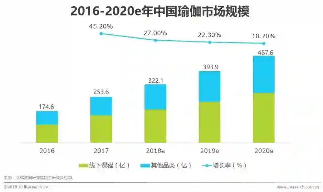 艾瑞认为2018年瑜伽市场规模将到达322.1亿元,增长主要来自瑜伽垂直产品(服装、瑜伽垫、辅具等)等产品。2015-2017年,瑜伽的增长主要来自高速增长的泛人群及核心人群,以及线下瑜伽馆及工作室的课程收入。2018年后瑜伽市场基于核心人群的快速增长而产生的规模增长正在减弱。同时,现阶段线下瑜伽馆与工作室之间以价格竞争为主,客单价的提升有限。