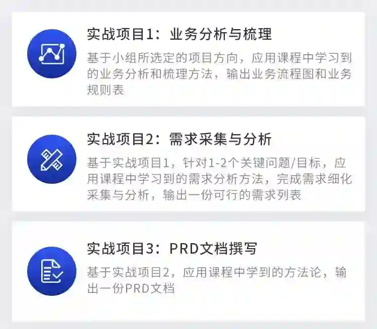 课程会围绕“分析/梳理业务 → 洞察需求 → 产品设计 → 开发与实施 → 迭代与运营 → 产品架构设计“等核心内容展开,帮助你掌握全流程工作要点,同时学会将所学内容运用到具体的工作中去。