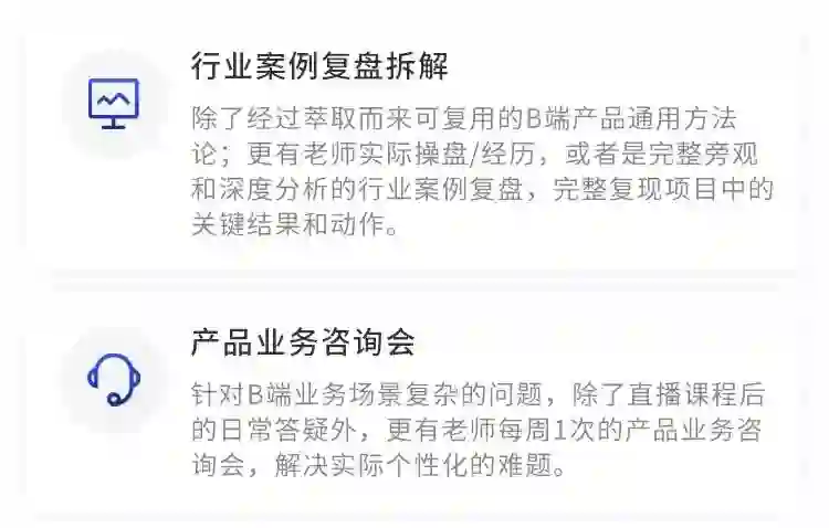所以除了详细的学习内容,课程考虑到B端业务场景的复杂性,除了日常答疑,课程配有还有5大行业案例复盘拆解(涵盖CRM系统、电商、企业信息化、saas、金融等领域)、12场产品业务咨询会,帮助你有效解决实际难题。