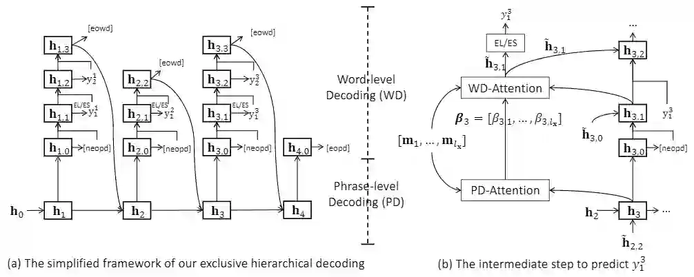 新提出的互斥分层解码框架示意图。h_i 是第 i 个短语级解码步骤的隐藏状态,h_{i,j} 是对应的第 j 个词级解码隐藏状态