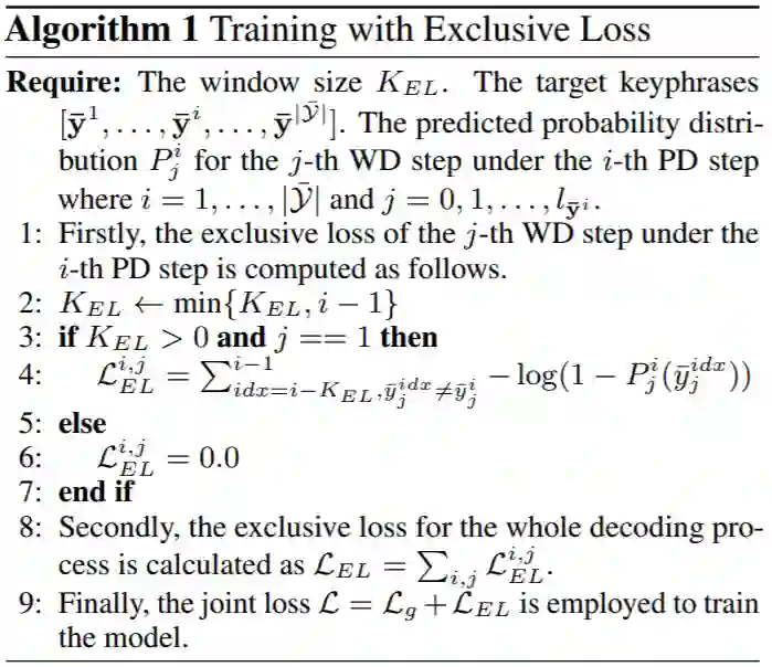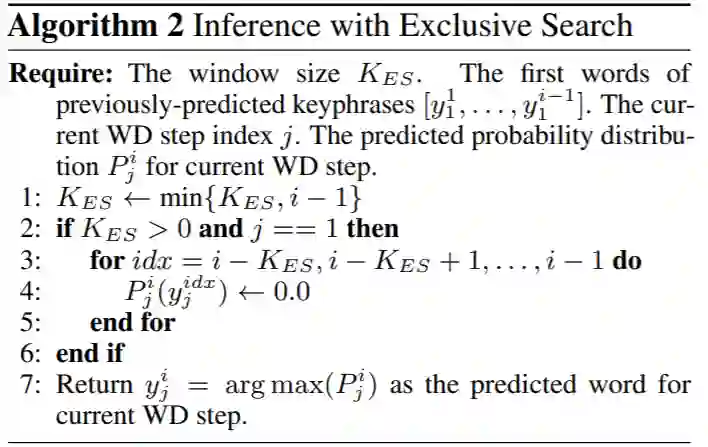 关键词生成(KG)的目的是将文档的主要思想概括成一组关键词。最近在这个问题中引入了一种新的设置:给定一个文档,模型需要预测一组关键词,并同时确定要生成的关键词的适当数量。此前的工作在此设置中采用了一种顺序解码过程来生成关键词。然而,这样的解码方法忽略了文档中的关键词中存在的内在层次性。此外,以前的工作往往会产生重复的关键词,进而造成时间和计算资源浪费。为了克服这些局限性,本文提出了一种互斥分层解码框架,该框架包括一个分层解码过程和软性或硬性互斥机制。分层解码过程是为了显式地建模一个关键词集合的分层构成性。软互斥机制和硬互斥机制都会在一定的窗口大小内保持对之前预测的关键词的跟踪,以增强生成的关键词的多样性。我们在多个 KG 基准数据集上进行了大量实验,结果证明新提出的方法可以有效生成更少重复和更准确的关键词。
