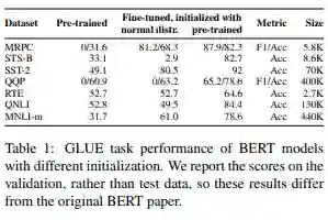 如下表所示,对使用正太分布中随机采样得到的权值初始化的 BERT 进行调优,其性能得分始终低于使用预训练权值初始化的 BERT。然而,在某些任务(如 MRPC )上,性能的下降并不太显著。