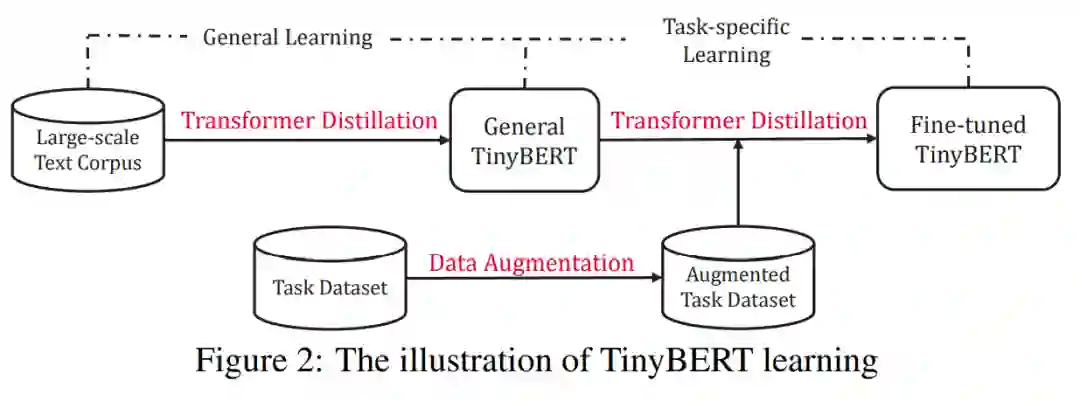 此外,作者还引入了一种新的两阶段学习框架:在预训练和特定任务学习阶段都执行 Transformer 蒸馏。这种框架保证了 TinyBERT 可以同时捕获 BERT中通用领域中和特定任务的知识。