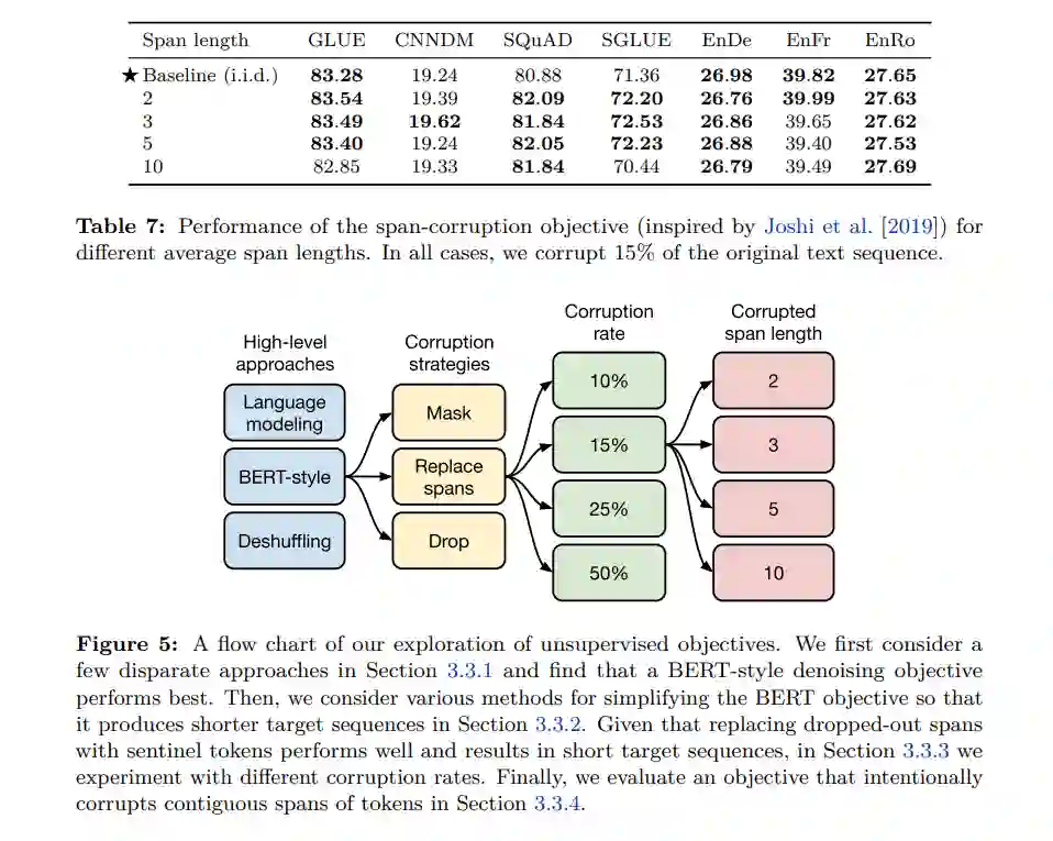 针对任务的目标序列长度,论文「Exploring the Limits of Transfer Learning with a Unified Text-to-Text Transformer」进一步指出,将丢弃的跨度区间长度选择为 3 是较为合适的。具体而言,作者将平均跨度区间设置为 3,原始序列的丢弃率设置为 15%。他们发现这种目标可以得到较好的性能,此时由于目标序列长度较短使得计算效率较高。