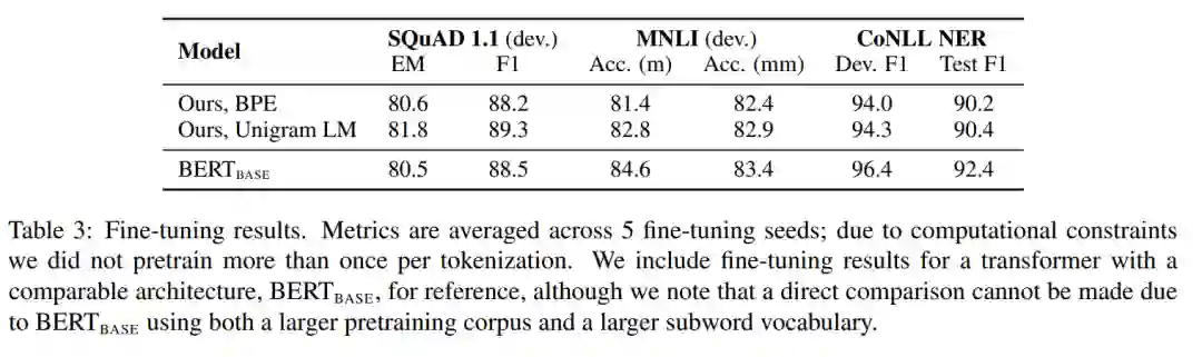 Unigram LM 方法可以恢复出更好地与底层词法相匹配的子词单元,并且避免 BPE 词干提取的贪心构造过程中的一些缺点。作者还对比了使用 Unigram、BPE 等分词方法的相同的 Transformer 掩模语言模型的调优性能。